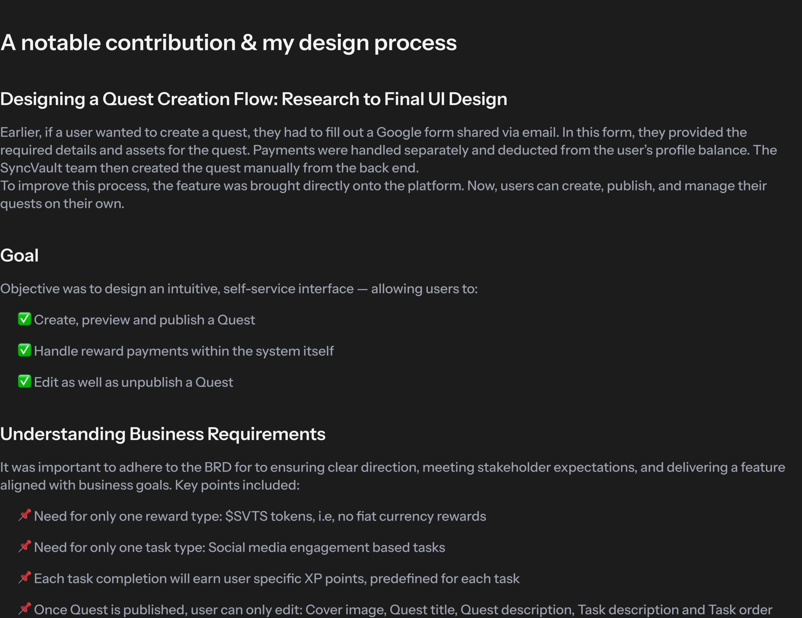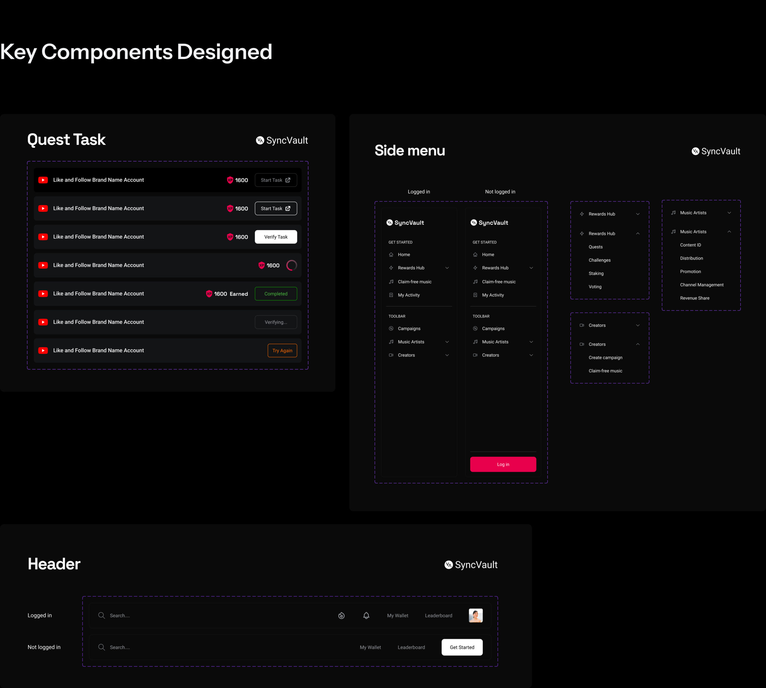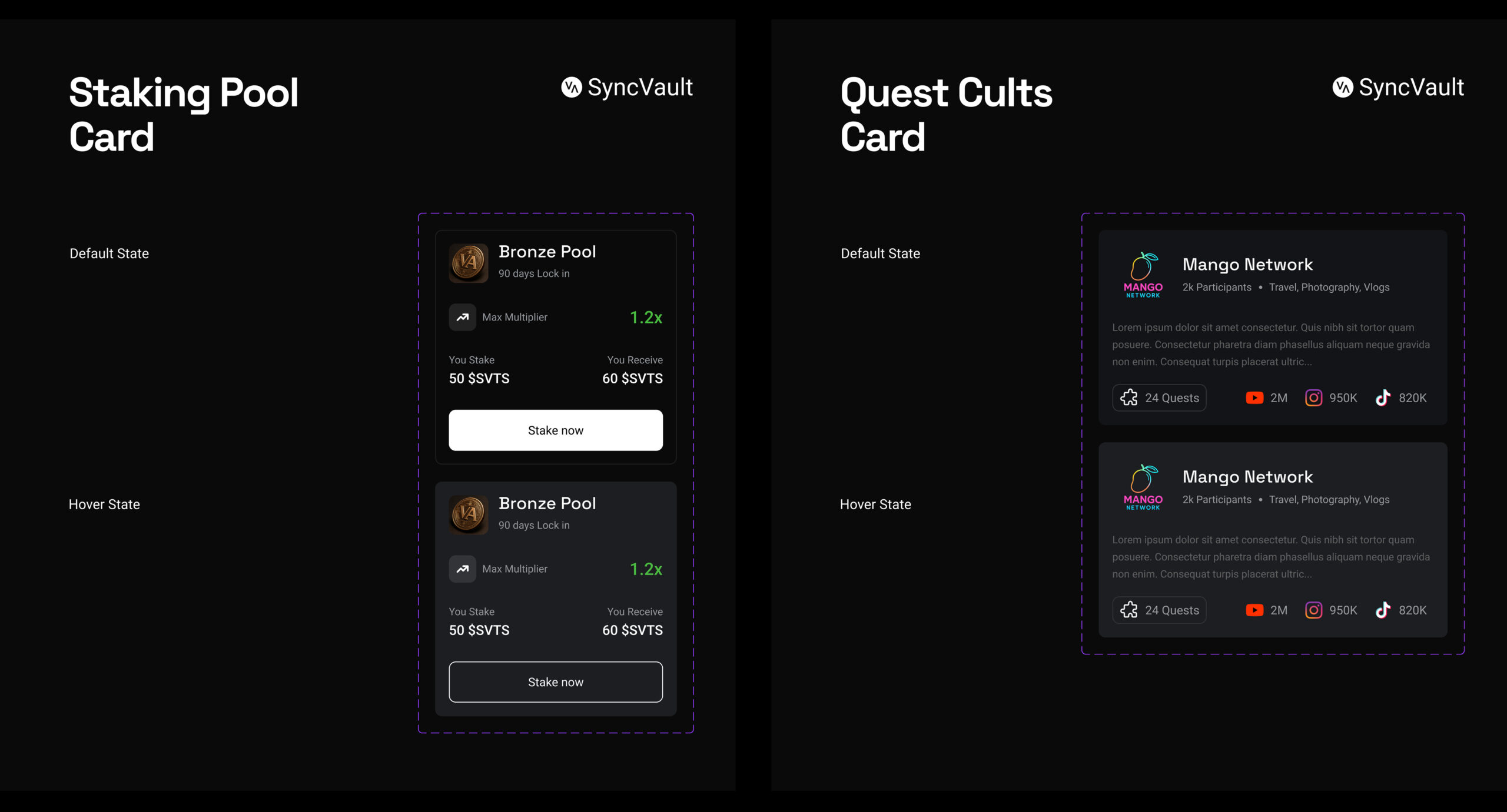 View SyncVault view user flow View User Flow Onboarding: Step-by-step guide to help users get started with the app, ensuring a smooth and easy account setup process. View Prototype Wallet: Walkthrough of wallet functionalities include Buying, Sending, Depositing and Swapping of tokens. View Prototype Quest User Flow: Demonstrating how user participates in a quest and complete tasks. View Prototype Quest CreationFlow: Demonstrating how user can create a quest in four simple steps View Prototype