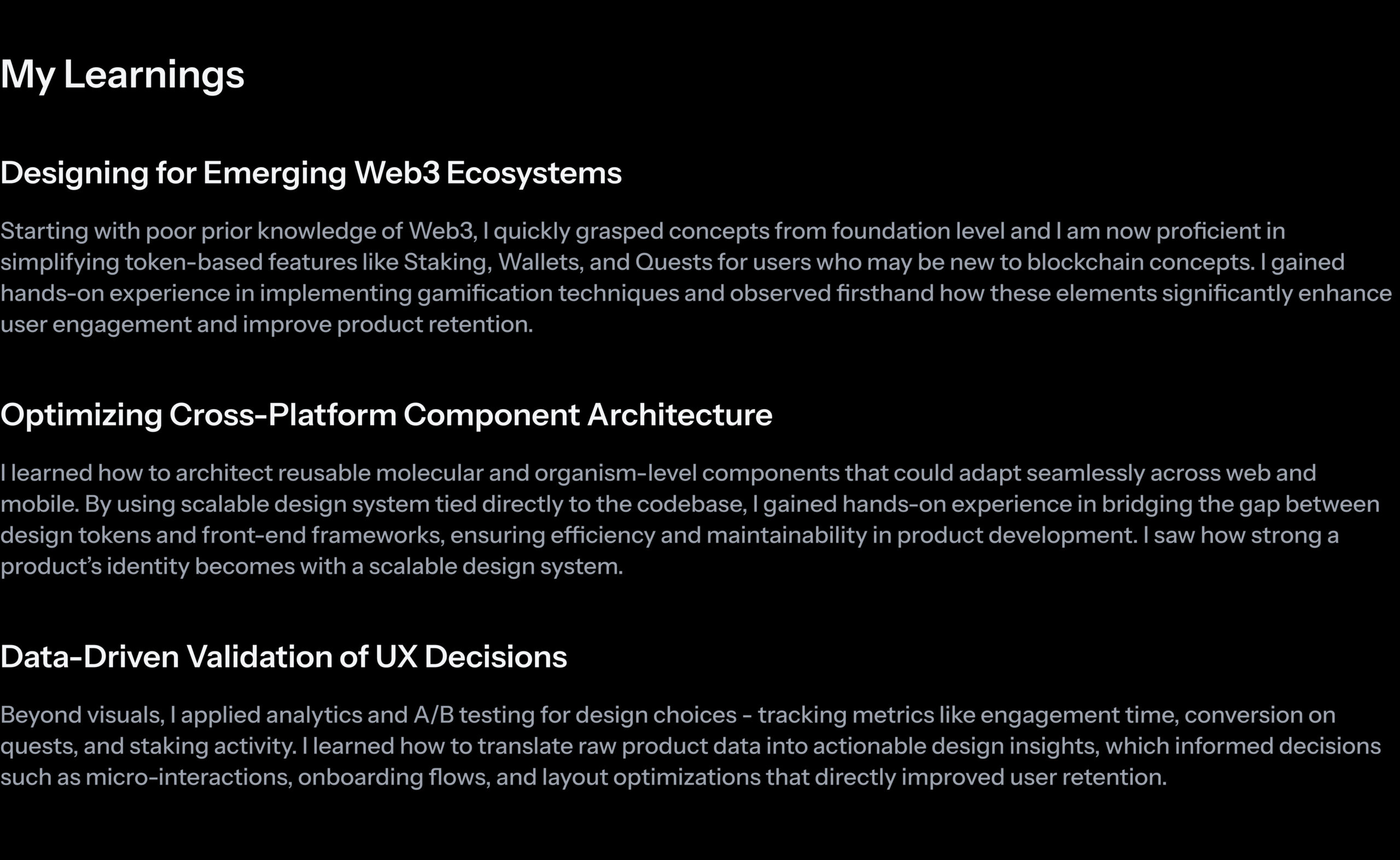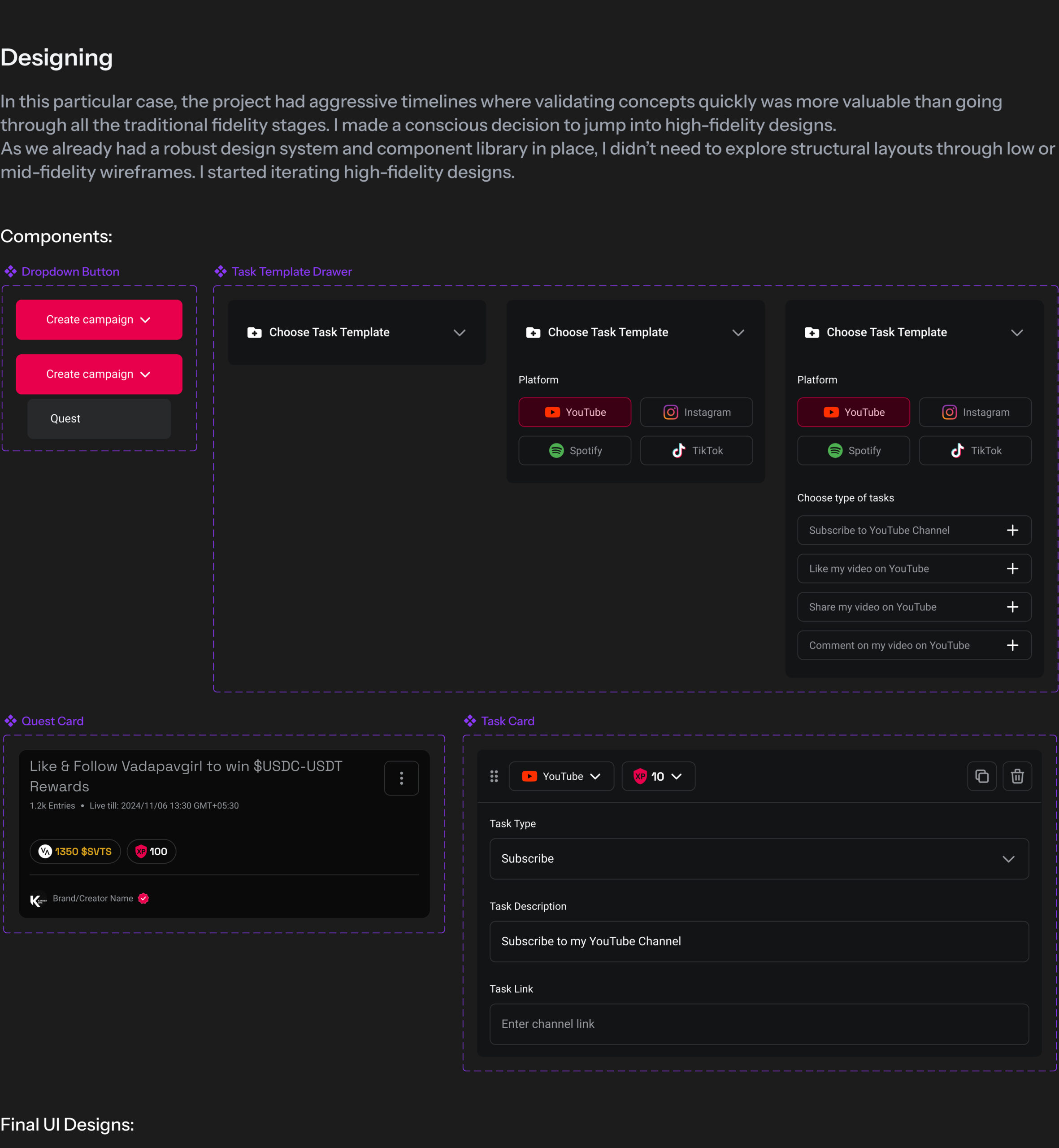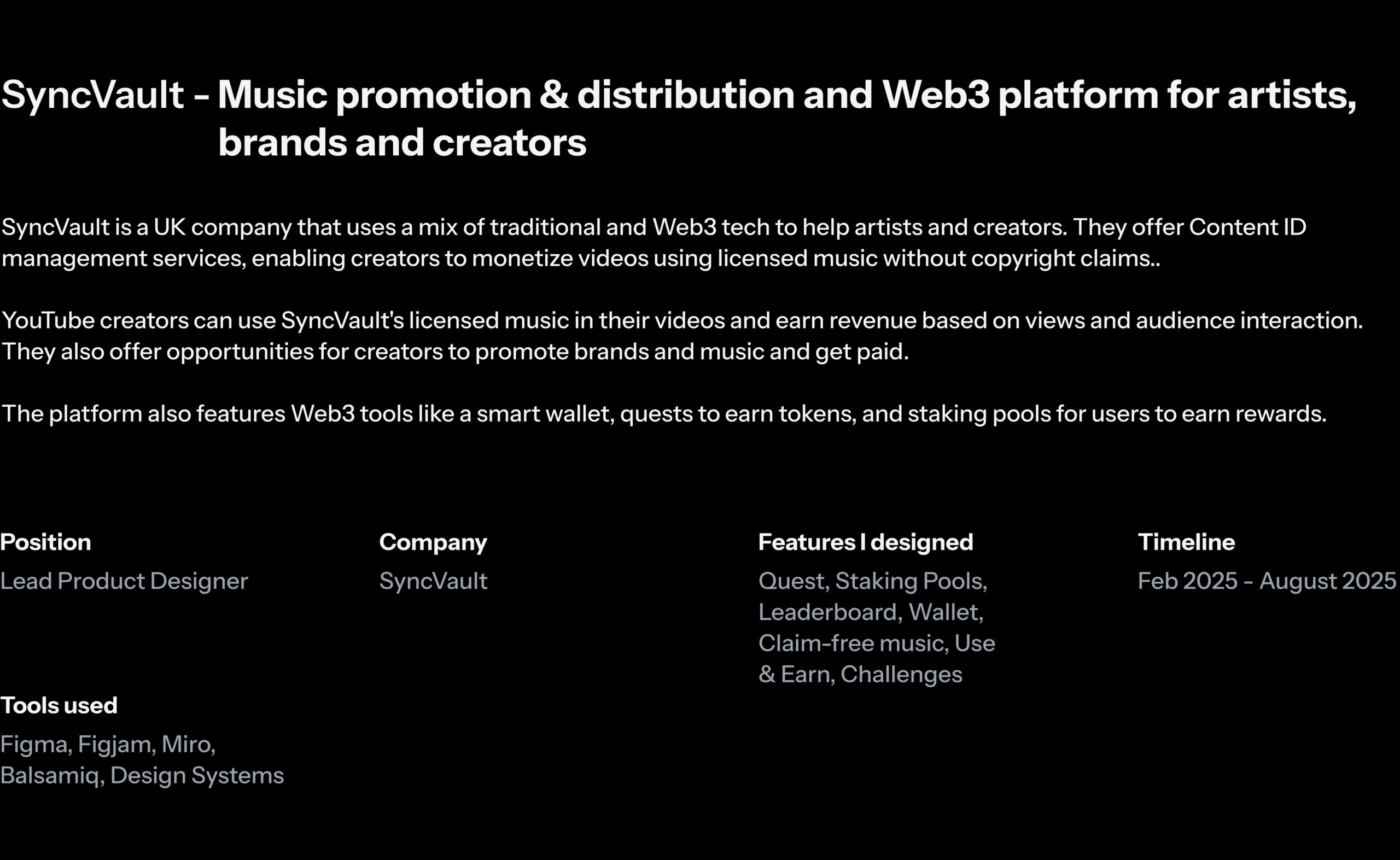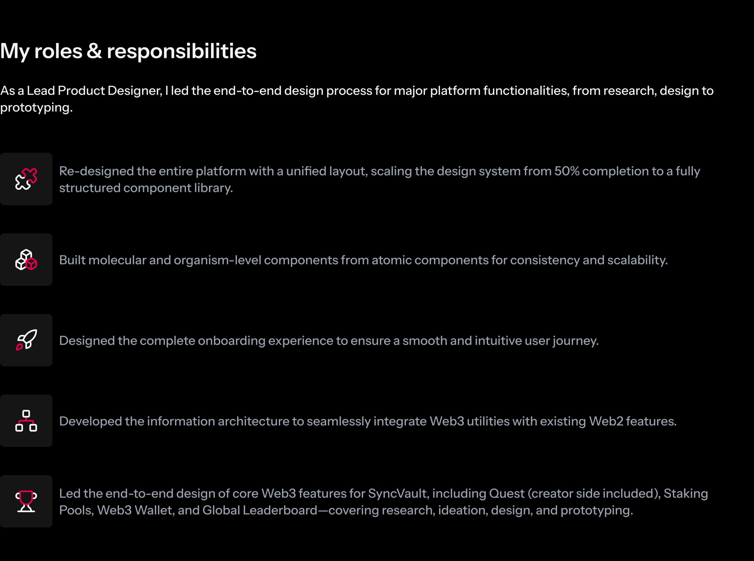 View SyncVault view user flow View User Flow Onboarding: Step-by-step guide to help users get started with the app, ensuring a smooth and easy account setup process. View Prototype Wallet: Walkthrough of wallet functionalities include Buying, Sending, Depositing and Swapping of tokens. View Prototype Quest User Flow: Demonstrating how user participates in a quest and complete tasks. View Prototype Quest CreationFlow: Demonstrating how user can create a quest in four simple steps View Prototype